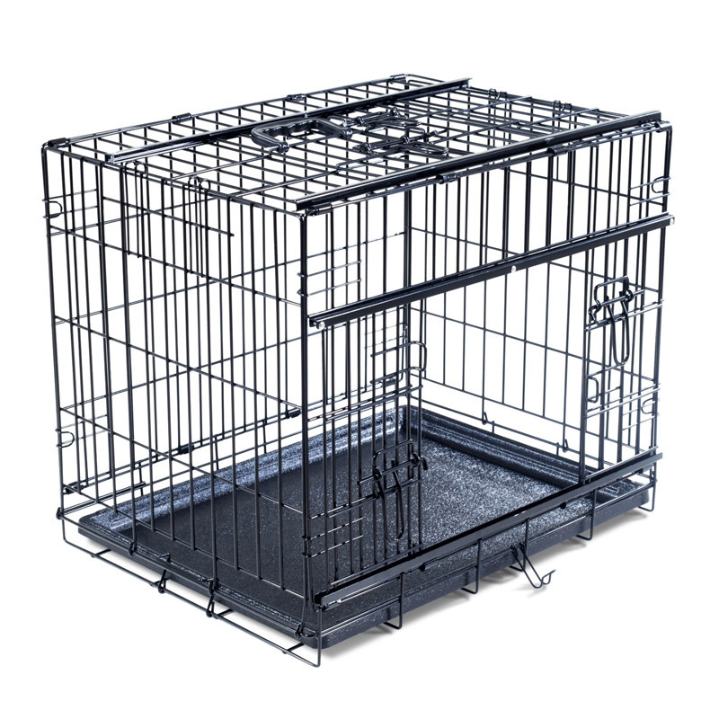 Cette cage pliable est munie de 2 portes d'accès coulissantes, l'un latérale et l'autre est située sur le haut de la cage, chacune équipé d'un loquet.