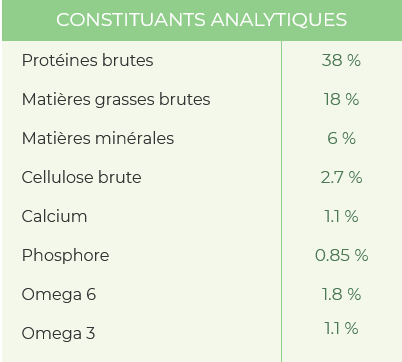 Vitamine A : 11250 UI/kg, Vitamine D3 : 1125 UI/kg Vitamine E : 300 mg/kg, Fer (sulfate ferreux, monohydraté) 57 mg/kg, Manganèse (oxyde manganeux) 20.8 mg/kg, Cuivre (sulfate cuivrique, pentahydraté) 10 mg/kg, Zinc (sulfate de zinc, monohydraté) 100 mg/kg, Iode (iodate de calcium, anhydre) 1 mg/kg, Sélénium (sélénite de sodium) 0.2 mg/kg